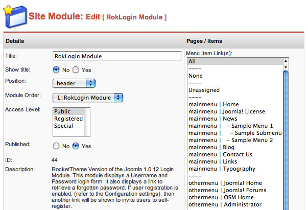 You can access the module configuration screen and edit the module by clicking on the module title of the module named RokLogin Form