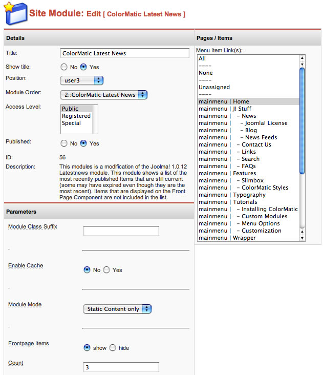 - Set the "Parameters" of the module to reflect how and what latest news items you want to display. There are several options you can customize.