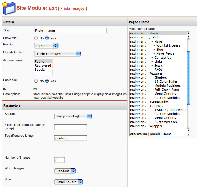 - In the Module configuration, there are various options that you can customize to your needs including: Image Source, Flickr ID (User or Group), Tag (If source is set to Tag), Number of Images to display, Module display size, and more.